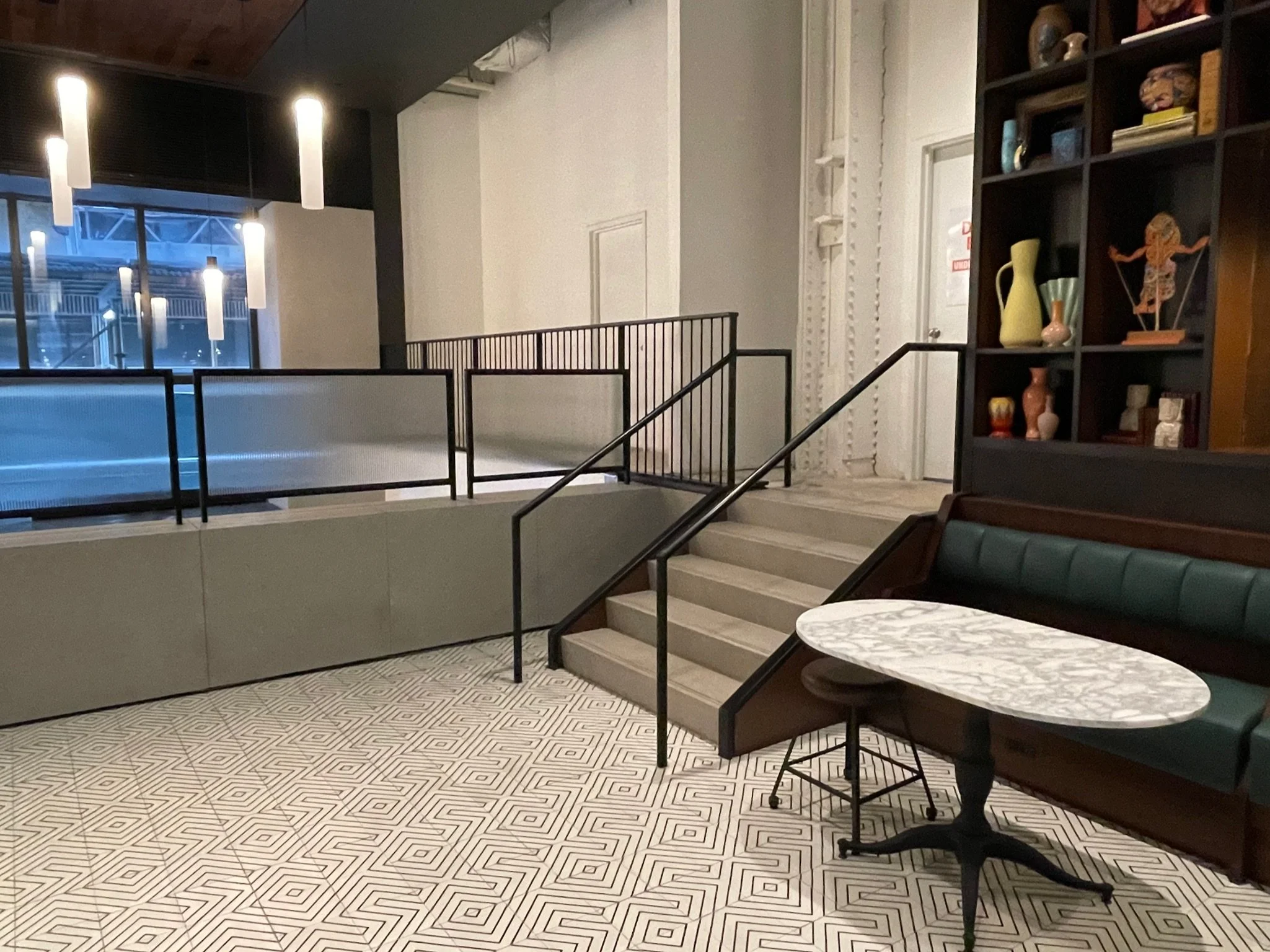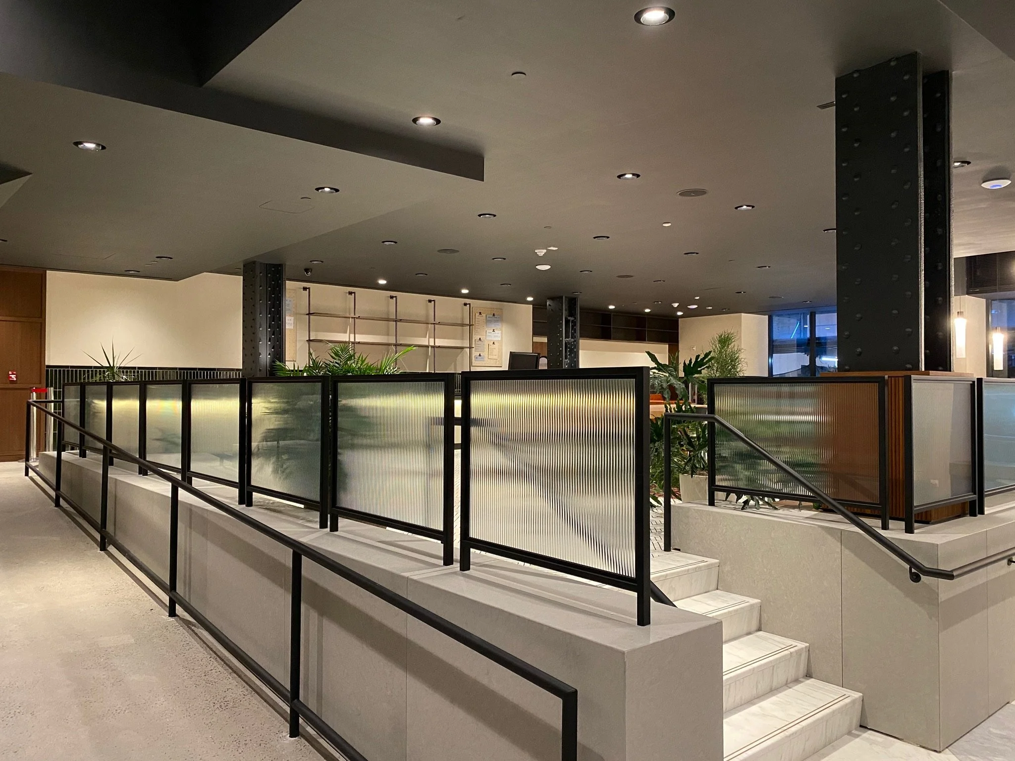 Fabrication of stair railings. guardrails, lobby desk, elevator lobby chandeliers