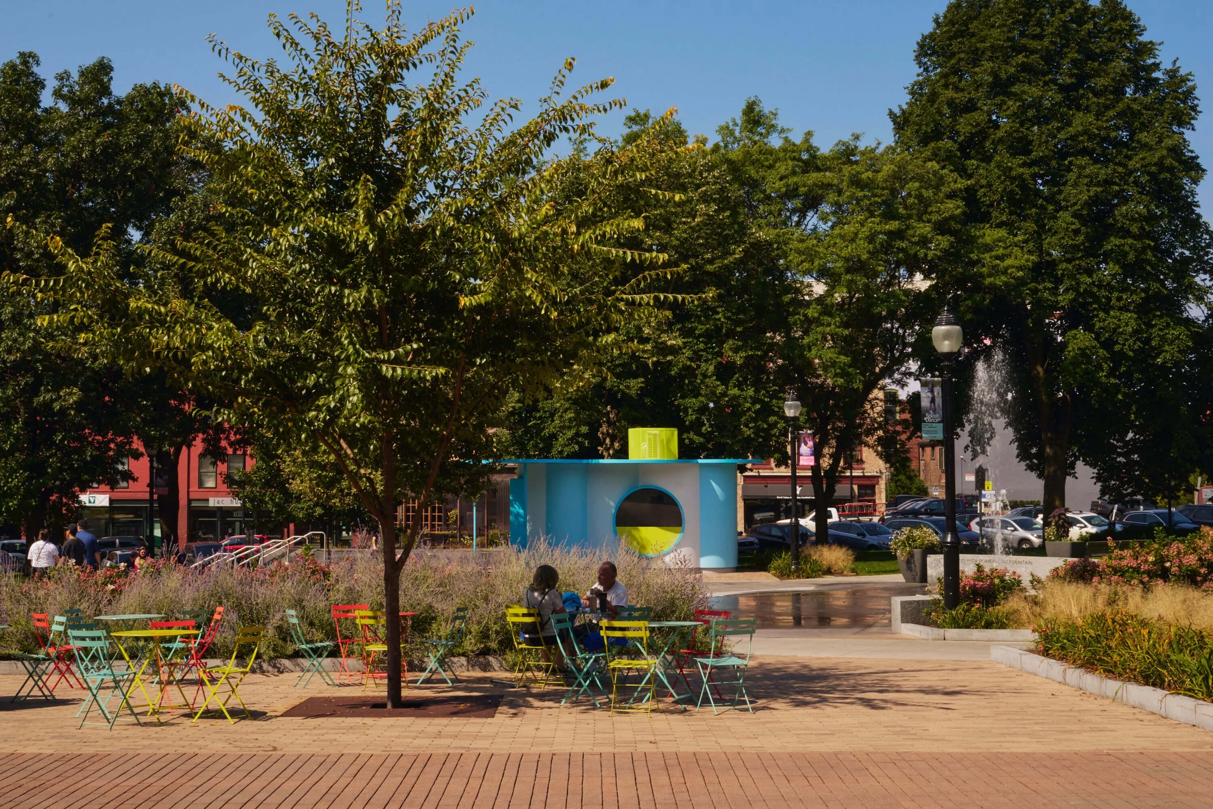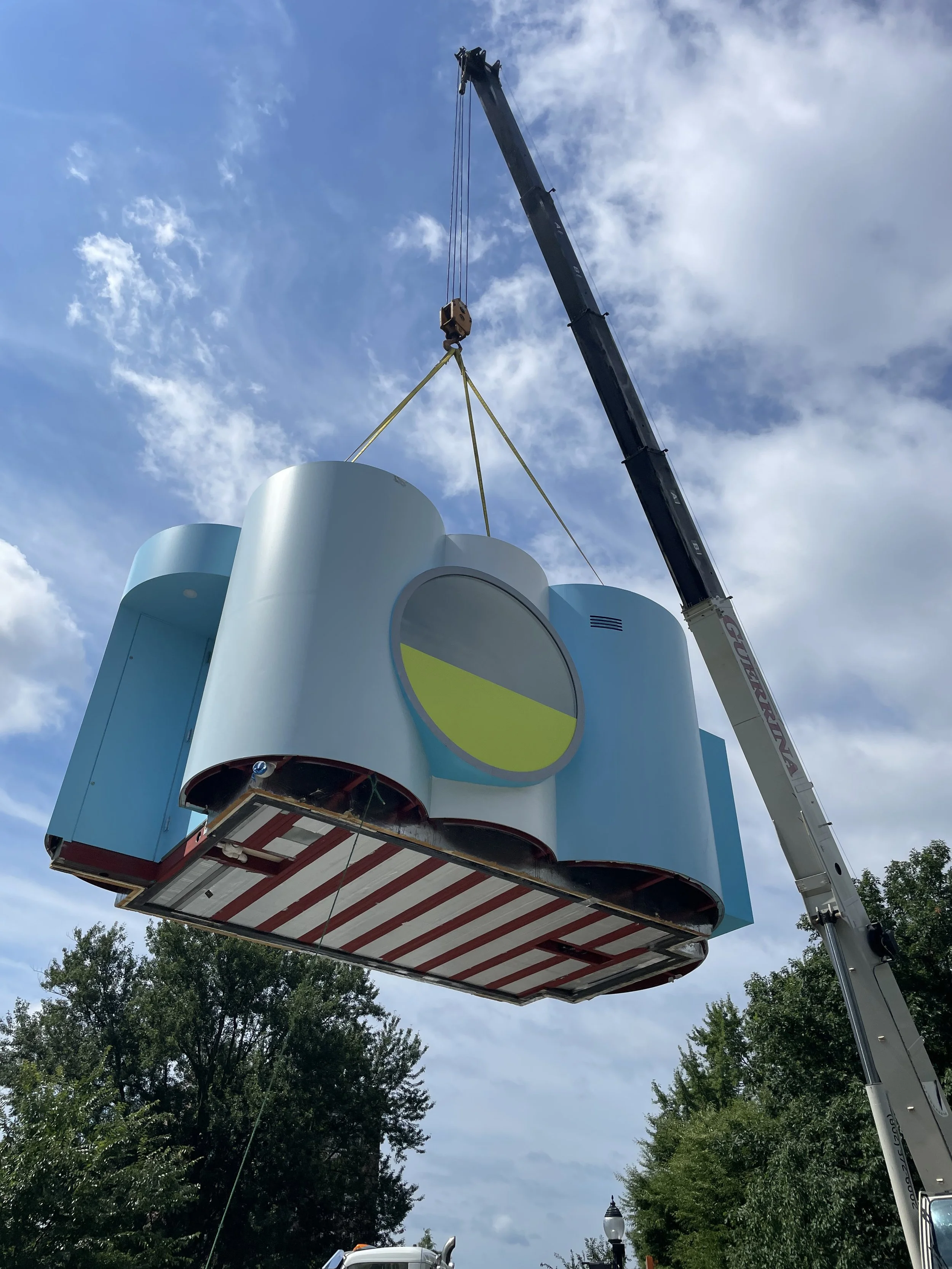 The vision for The Cloud is simple, yet profound: to infuse a splash of color, creativity, and cheer into Burlington’s beautifully designed City Hall Park, and further beyond into Vermont’s natural splendor. This project is a synergized effort between RENZ+OEI and Wade and Leta, who are equal parts collaborators and neighbors in Brooklyn, New York. RENZ+OEI led the project, combining their architectural and masterful fabrication expertise with Wade and Leta’s graphic aesthetic to together conceive a design that could become an iconic destination within the natural beauty of Burlington’s City Hall Park.
